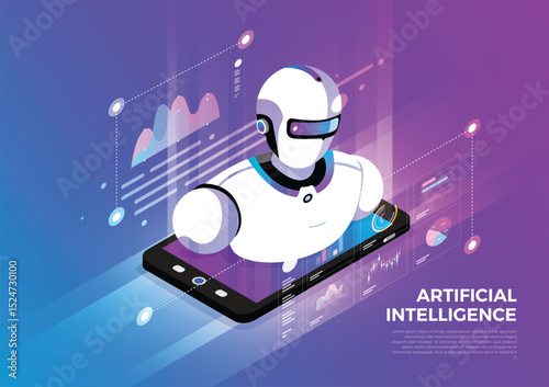 AI chat robot analyzing business graph chart data on smart phone. Artificial intelligence technology revolution and development, machine learning. Implement of robotic science research in business.