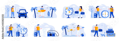 Travel concept set in flat design for web. Collection with people go in vacation with luggage, travelling in couple in romantic journey, booking tickets, planning global trip. Vector illustration.