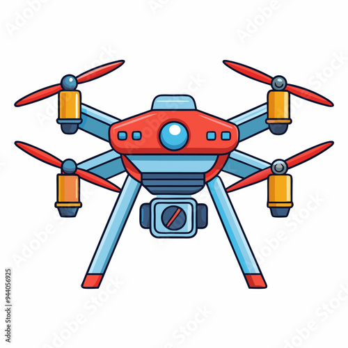 Quadcopter drone vector illustration with camera, modern technology design for aerial photography, surveillance, and videography, unmanned flying gadget, remote control aviation concept