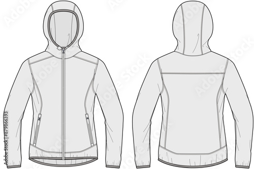 Hooded softshell jacket technical CAD fashion illustration front and back views