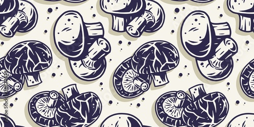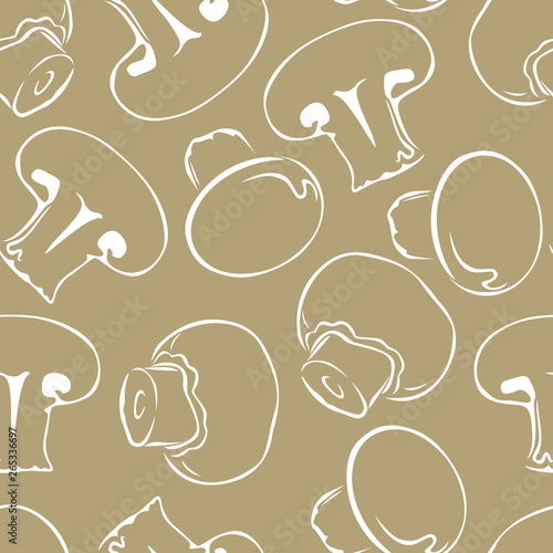 Colored seamless pattern wallpaper with vegetarian champignon silhouette for any holiday. Autumn illustration of mushroom picking for nature theme design