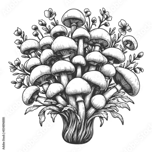 Black and white illustration of a mushroom with detailed texture on white. Vector illustration in sketch style