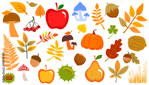 Colorful autumn set of season leaves, pumpkins, mushrooms and acorns isolated on a white background. Vector cartoon illustration