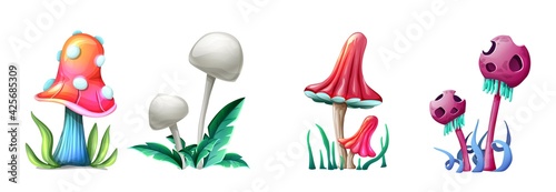 Collection of various colorful mushrooms. Set of edible and poisonous forest mushrooms. Forest grass and leaves. Cartoon vector illustration isolated on a white background.