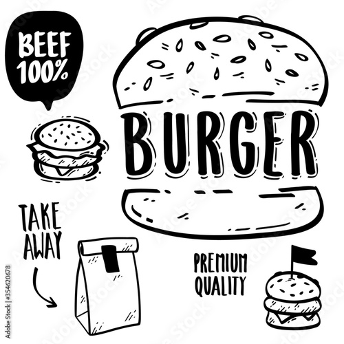 Graphical sketch of hamburger isolated on white background,vector illustration. Modern design street food logotype. Cheeseburger flat icon for printing, fast food.