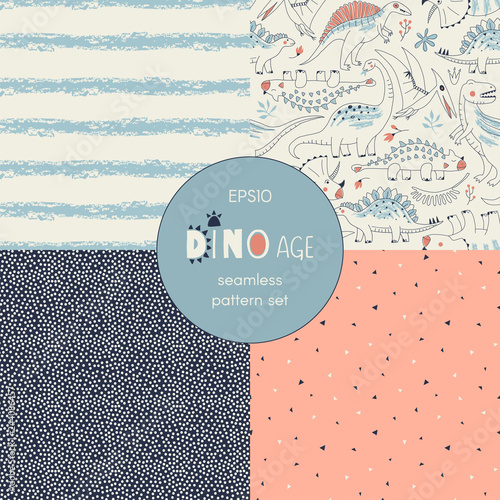 Dinosaur themed vector seamless background set includes cute dino reptiles, stripes and geometric triangle patterns, vector graphics, kids and baby summer textile tee shirt apparel print