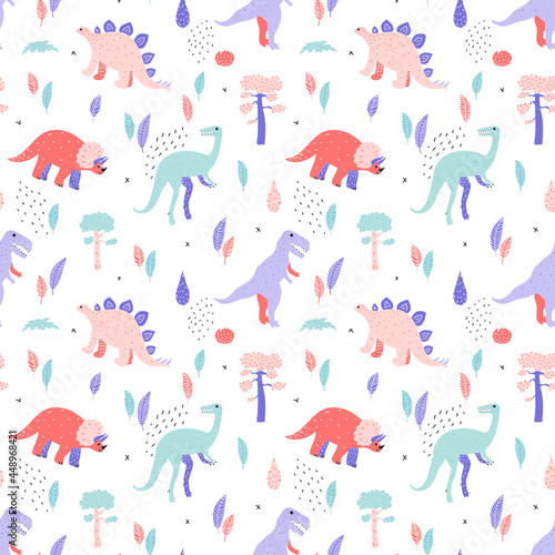 Seamless pattern with dinos in pastel colors, pine trees, bushes and leaves. Cute doodle childish design. For prints, backgrounds, wrapping paper, textile, linen, wallpaper, etc.