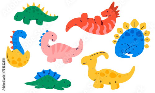 Set of flat vector illustrations in Scandinavian style. Cute kind dinosaurs in bright colors on white background . Vector illustration