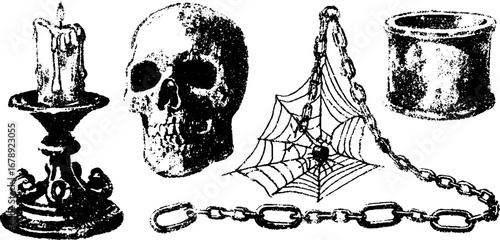 Vintage potion and alchemy elements with skull and candle in engraved style
