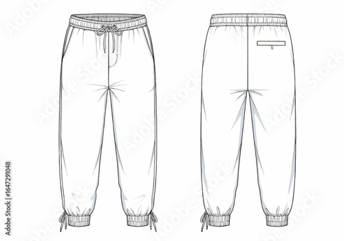 Jogger pants front and back view, cad drawing flat vector illustration, elastic waistband, drawstring closure, cuffed ankles, casual fashion garment sketch