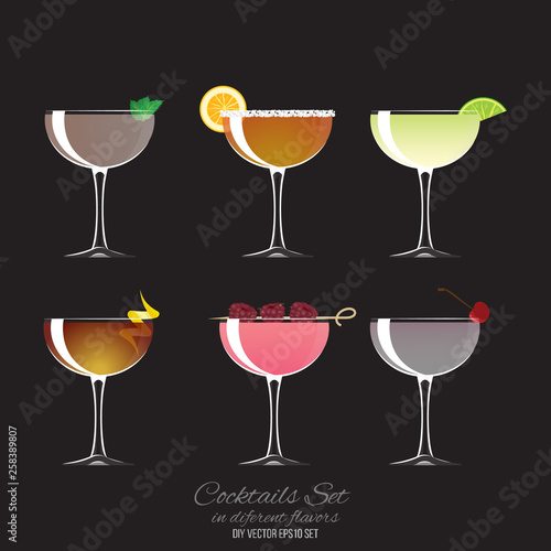 Cocktails silhouette. Image shows four cocktail silhouettes in different glasses like martini, margarita, and tumbler. Vector clipart illustration design.