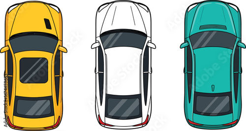 Top view illustration of five colorful cars parked in a row, featuring white, yellow, green, red, and blue vehicles for varied uses.
