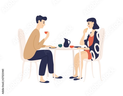 Man and woman  eating together in restaurant or cafe, flat cartoon vector illustration isolated on white background. People dining outdoor, sitting at table and enjoying food.
