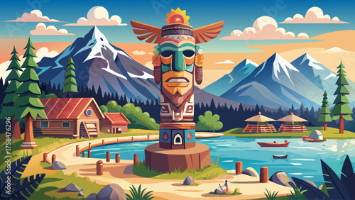 Very beautiful Totem Guard at Saxman Village near Ketchikan, Alaska, USA, showcasing a tall, intricately carved wooden totem pole, rich in cultural symbolism, set against lush green forest and mountai