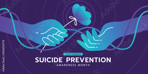 Suicide prevention awareness month - Teal and purple hand hold flower to hand with lines link around on dark blue purple background vector design