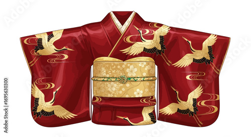 A red kimono with a golden obi and crane designs, displayed against a white background.