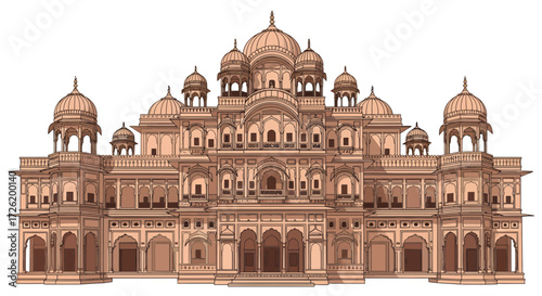 Detailed Vector Illustration of a Grand Ornate Palace Facade. Majestic Indian Architectural Drawing Featuring Domes, Arches, and Intricate Details. Traditional Royal Building Artwork