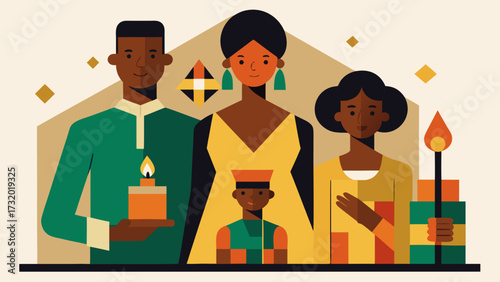 African American family celebrating Kwanzaa with candles and gifts in traditional clothing