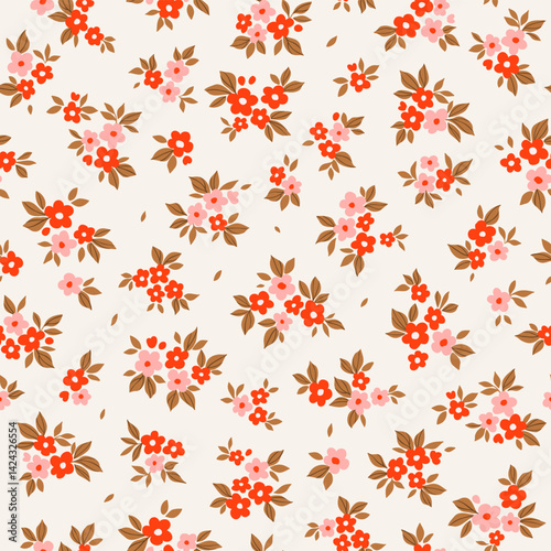 Cheerful seamless floral pattern with beautiful red and white daisies on swirling green vines against a warm peach background.