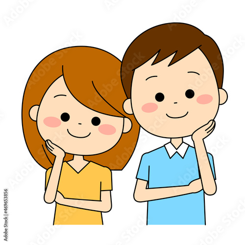 照れながら結婚を報告する男性と寄り添う彼女 カラーバージョン
