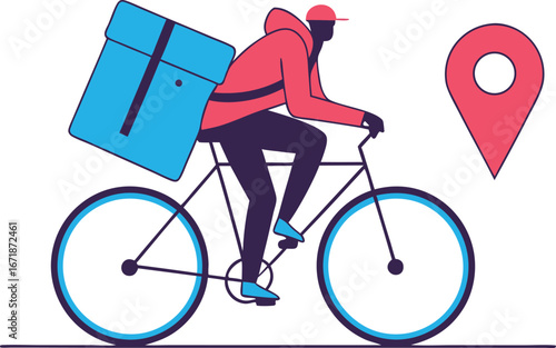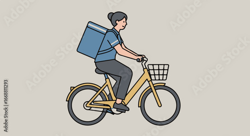 A delivery person on a bicycle with an insulated backpack is shown in this illustration.