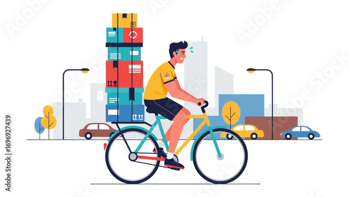 Isometric urban delivery scene with packages, road, and delivery person on bicycle