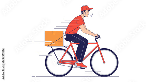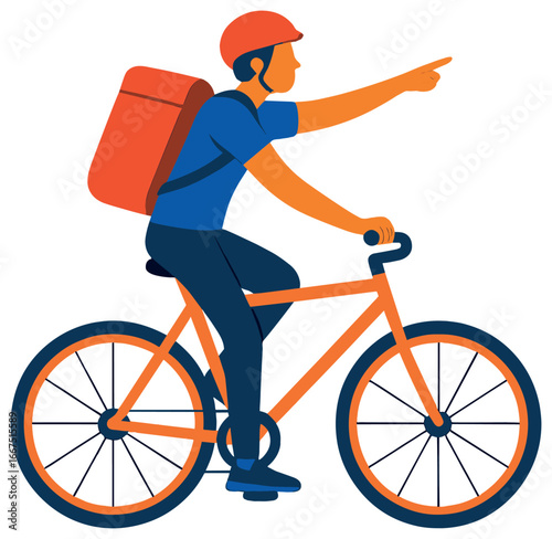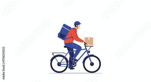 Isometric delivery cyclist in motion with red bicycle and helmet