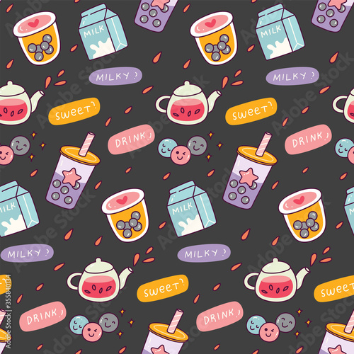kawaii cup of bubble tea with fruit flavor illustration. hand drawn vector. seamless pattern with cup of boba on colorful background. cute face. wallpaper, fashion kids, wrapping paper and gift.