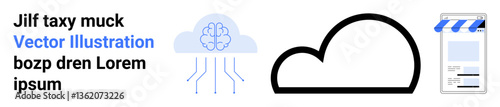 Brain-shaped neural network with lines, large cloud icon, and storefront graphic illustrating themes of AI, cloud tech, e-commerce, innovation, connectivity, and seamless integrations. Ideal