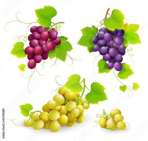 Red and white table grapes. Wine grapes realistic bunch vector icon set