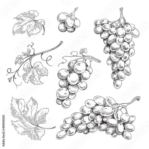 Vintage engraving style grape cluster with vine, leaf, and tendril illustration for retro design