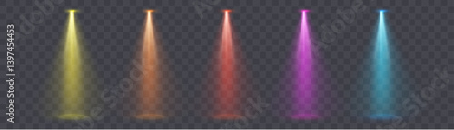 Set of vibrant spotlight beams in different colors on transparent background. Suitable for stage lighting, concert visuals, UI highlights, and creative performance designs.