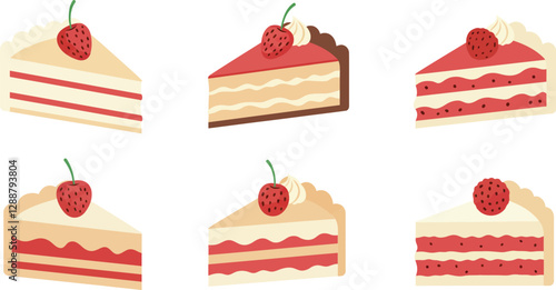 Vector illustration set of different flavors of cute style cake slices. Flat design, isolated on white. Vector illustration of bakery, birthday cake, party, celebration, festival, happy for greeting.