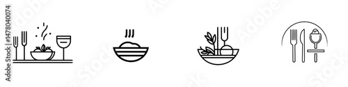 Vector illustration icons showing different dining experiences with bowls, utensils, and drinks suitable for culinary themes