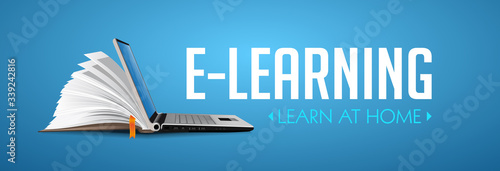 Computer as book knowledge base concept - laptop as elearning idea - stay at home and learn without going to school