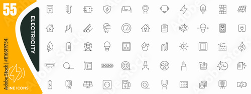 Set of 52 outline icons related to electricity. Linear icon collection. Editable stroke. Vector illustration