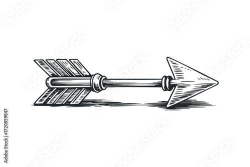Black silhouette of an ancient arrow with fletching on white background weapon projectile
