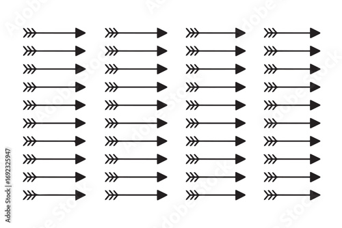 Collection of Fifteen Black-and-White Right-Pointing Arrow Designs Featuring Unique Patterns on Fletching, Shaft, and Arrowhead