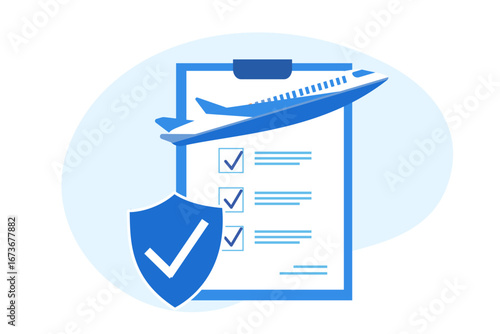 Flat vector travelers with luggage in airport with airplane under shield. Solid tropical colors, no gradients, ideal for travel agencies, insurance sites, and flight posters