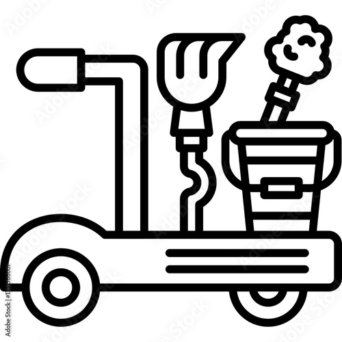 Outline doodle illustration of cleaning services text framed by essential tools and equipment, perfect for promoting janitorial and housekeeping businesses.