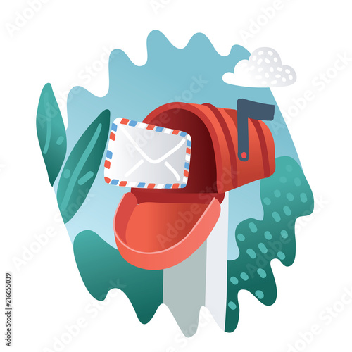 Red mailbox with letters inside in cartoon style. White envelope flies into the mailbox. Vector illustration isolated on blue background.