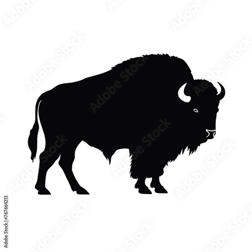 Black silhouettes of american bison. Natural panorama of forest animals. Isolated landscape. Wildlife scene. Vector illustration
