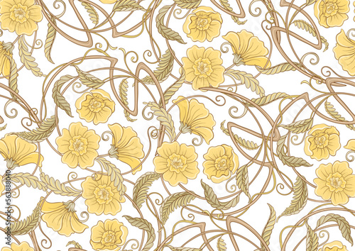 Decorative flowers and leaves in art nouveau style, vintage, old, retro style. Seamless pattern, background. Vector illustration. In art nouveau style, vintage, old, retro style.