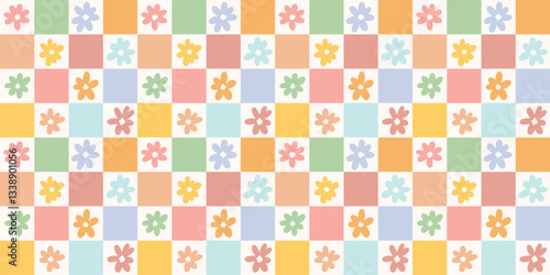 Colorful spring floral check vector pattern background, cute retro groovy daisy print wallpaper