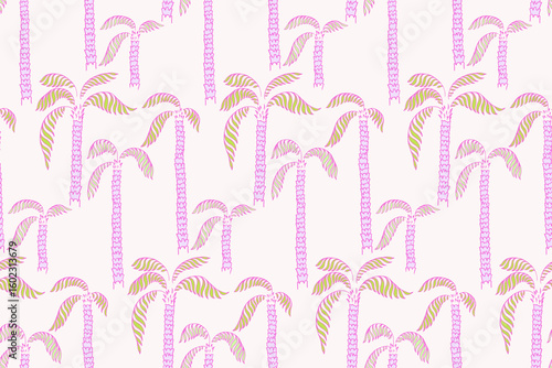 Seamless tropical vector pattern featuring hand drawn pink palm trees with textured trunks and curved leaves on a white background. Pastel print  for summer themed designs, textiles, wallpapers