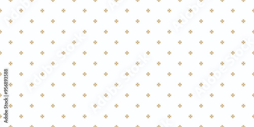 Vector golden minimalist geometric floral ornament. Simple seamless pattern. Ornamental texture with small flower shapes, crosses. Gold and white abstract background. Minimal repeating geo design