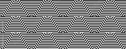 Futuristic technologic background by elements of hexagon. Black white striped seamless pattern. Op art, optical illusion. Vector texture.