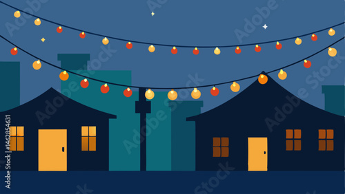 Cozy Cocoa Gathering. Hot cocoa stand. Children warming up with cups of cocoa under string lights; steam