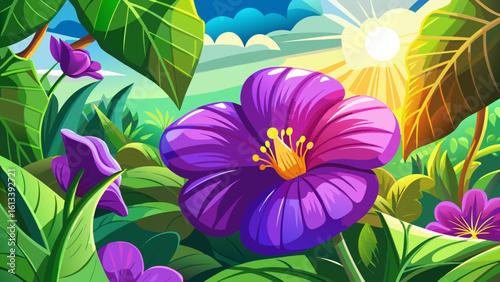 Adorable cat curled up in an open suitcase on a cozy bed beside plants and window. Warm peaceful illustration symbolizing travel, comfort, and home life.. Vector illustration