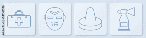 Set line First aid kit, Mallet for playing air hockey, Hockey mask and Air horn. White square button. Vector
